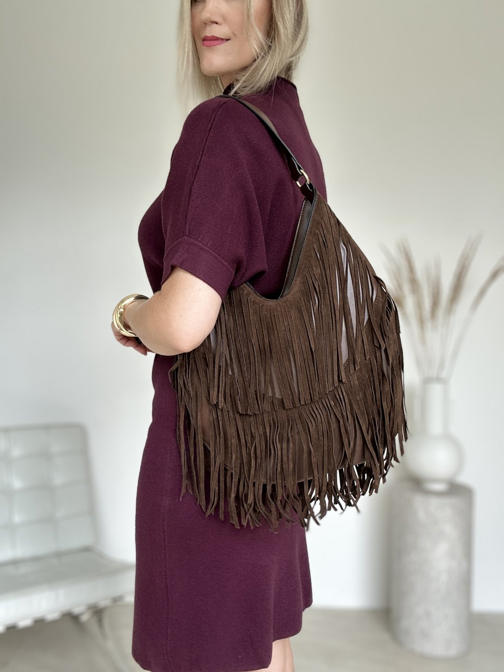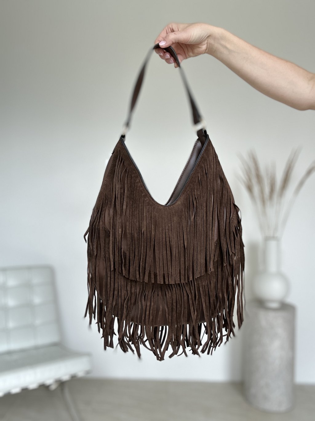 Moderná strapcová kabelka cez rameno s bohémskym štýlom, výrazne zdobená strapcami.Farba a materiál:Kabelka má hnedú KHAKI farbu a pôsobí ako semišová alebo z materiálu imitujúceho semiš.