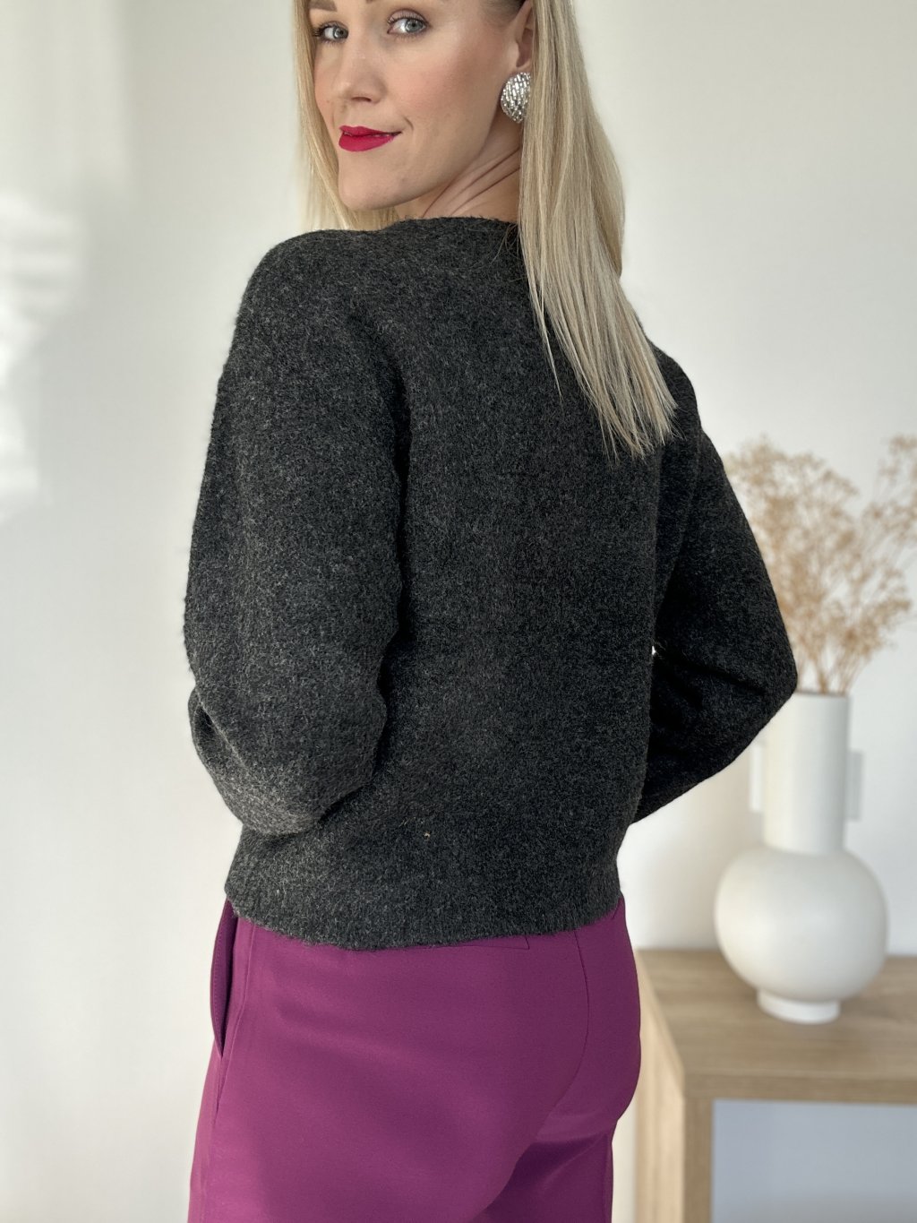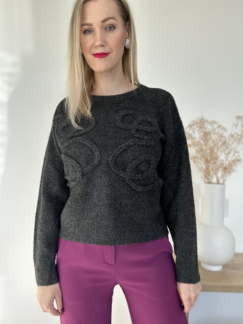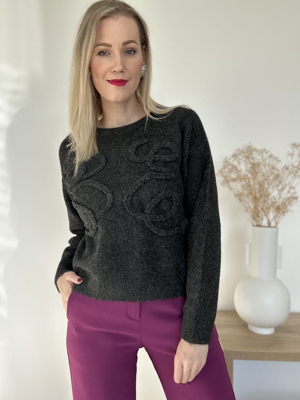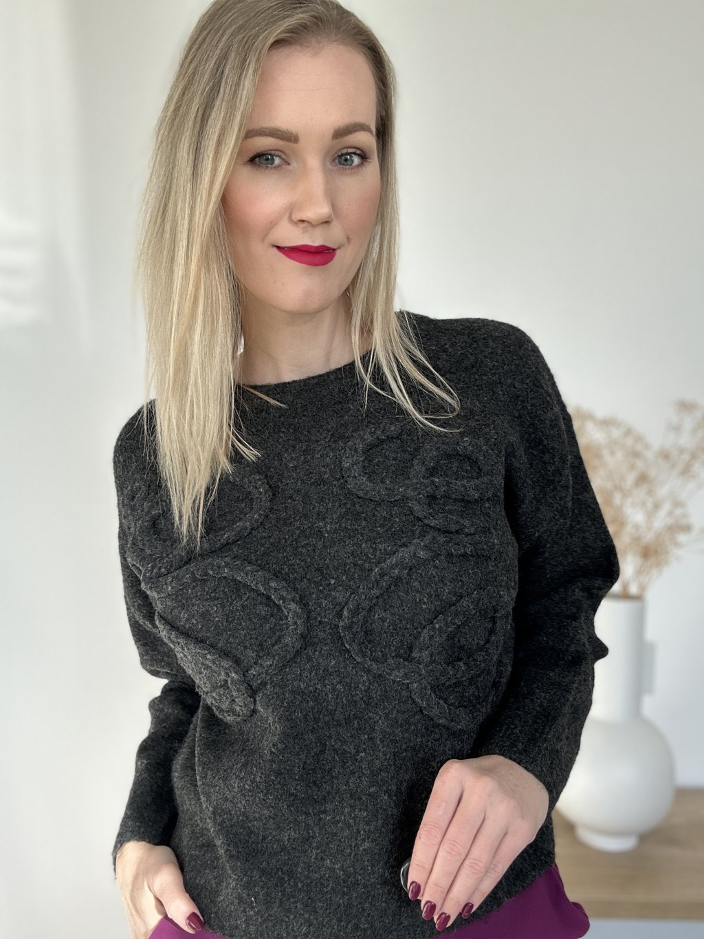 Sveter klasického strihu s jemnou aplikáciou. Sedí na veľkosť S/L.