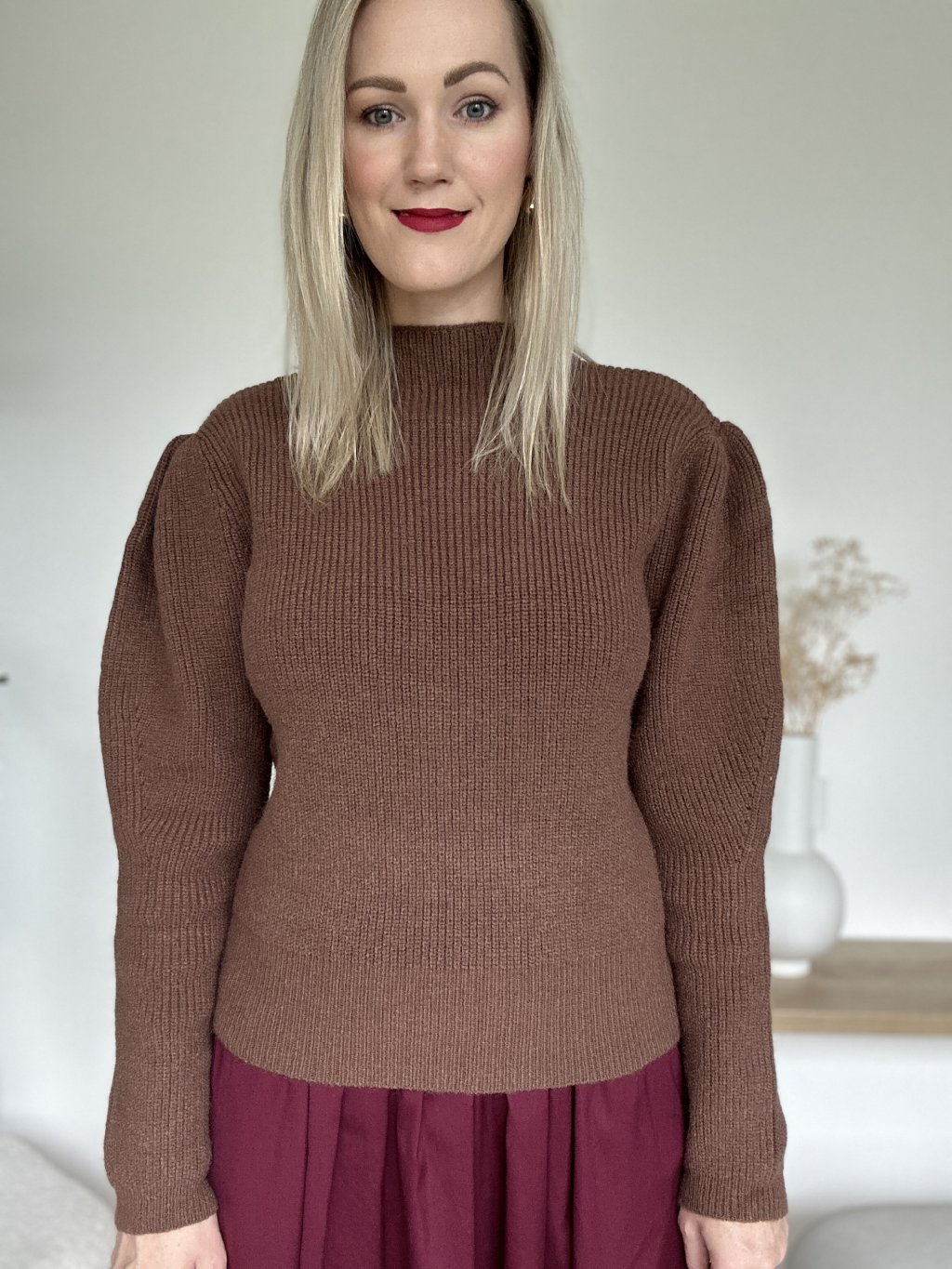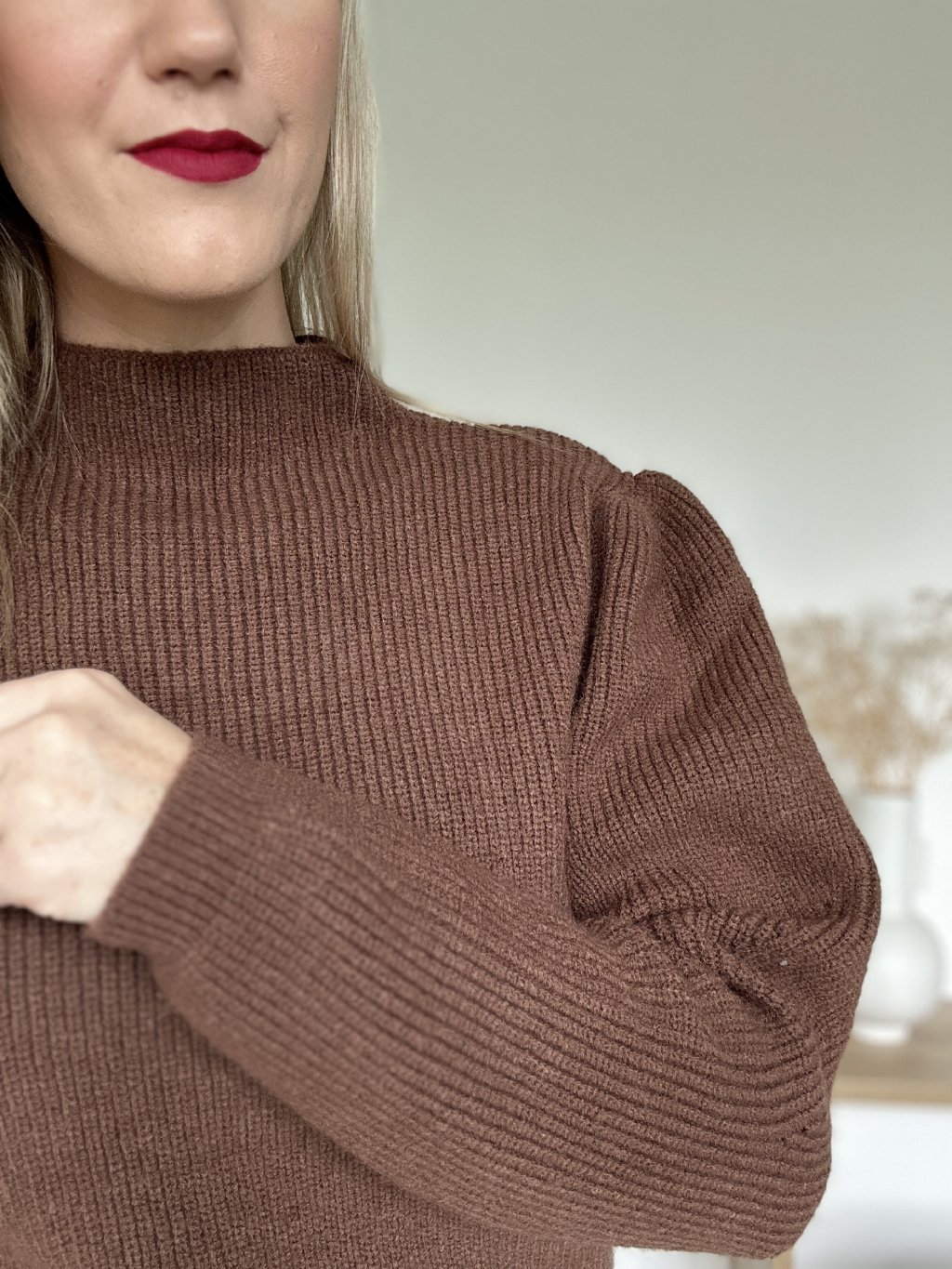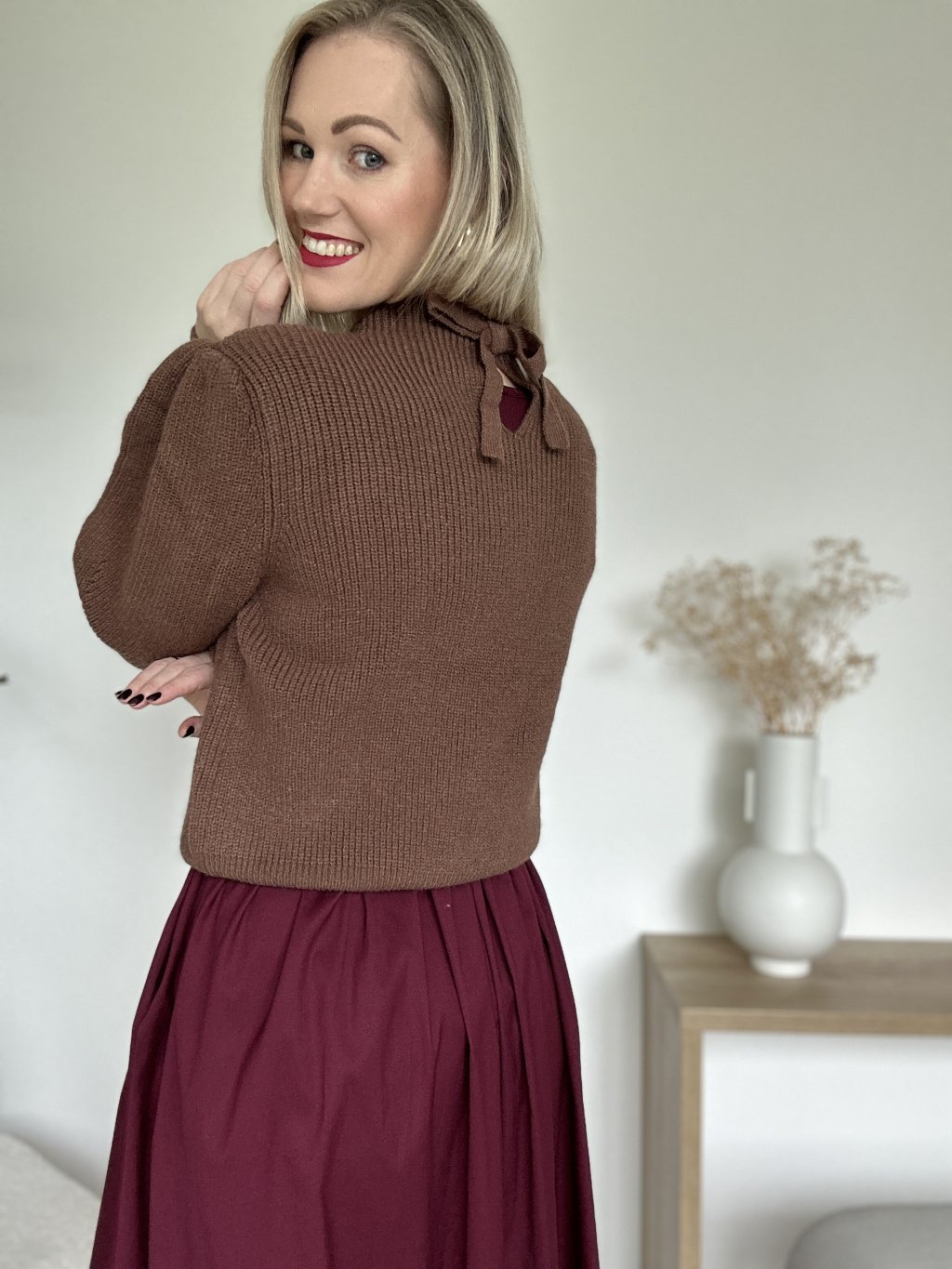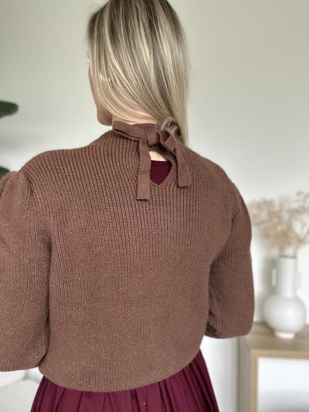 Svetrík klasického strihu so stojačikom doplnený o puf rukávy. Vzadu na krku je mašlička.