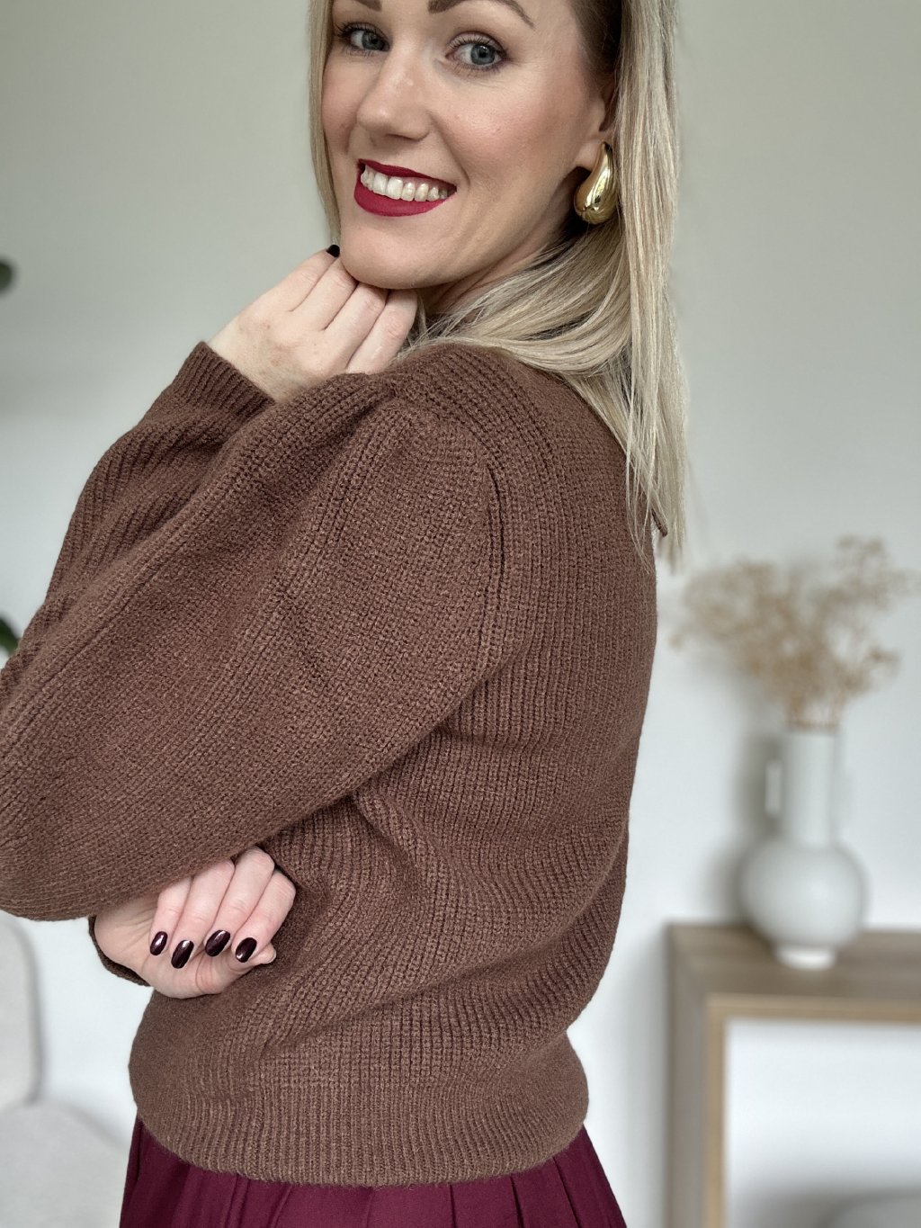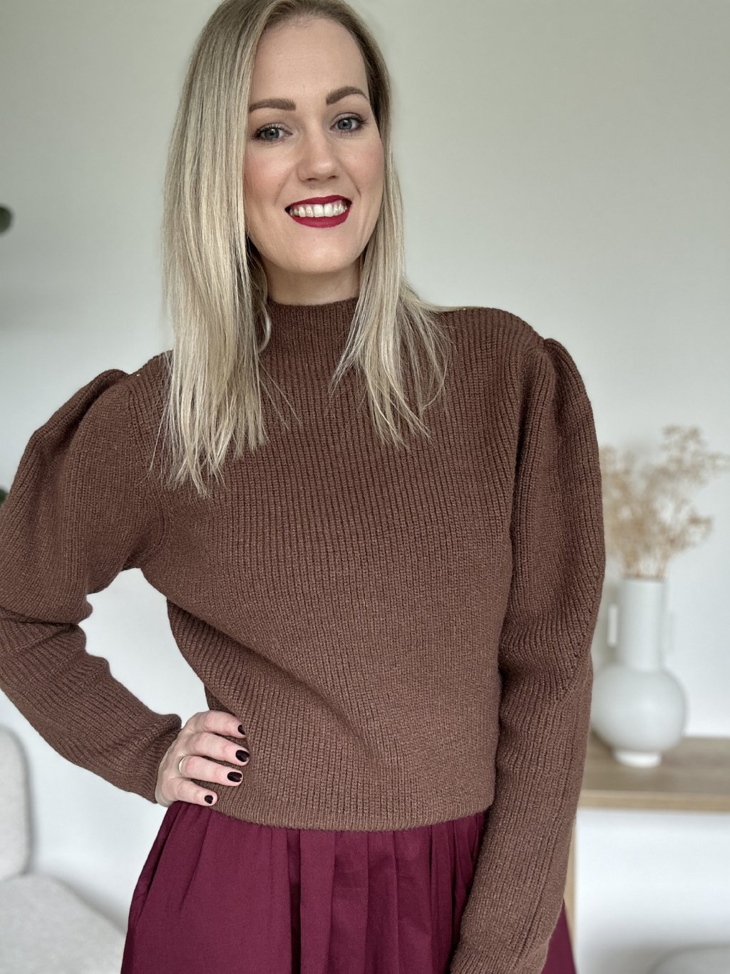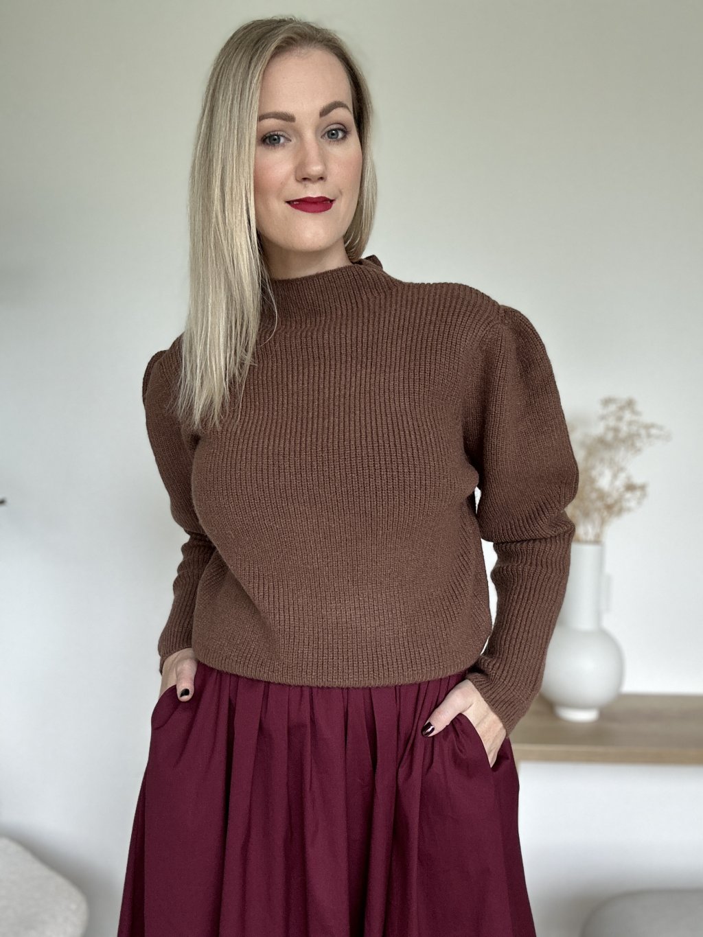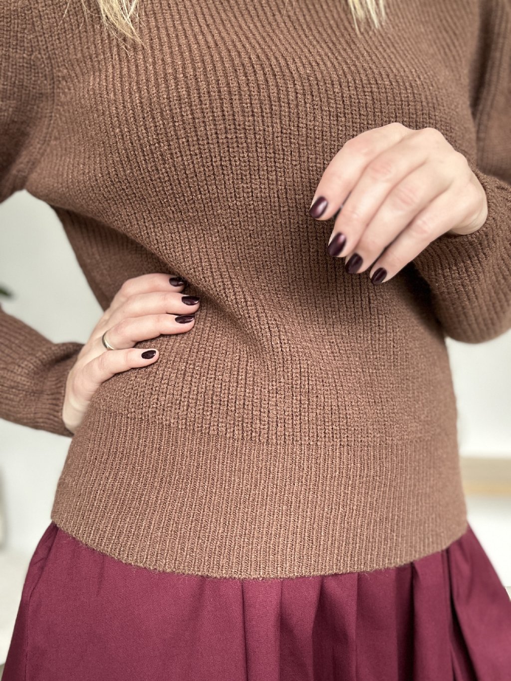 Svetrík klasického strihu so stojačikom doplnený o puf rukávy. Vzadu na krku je mašlička.