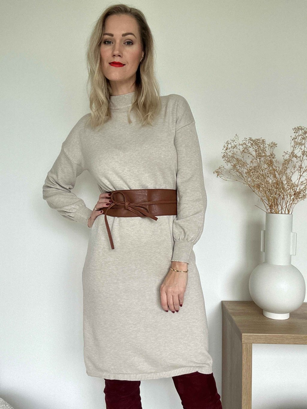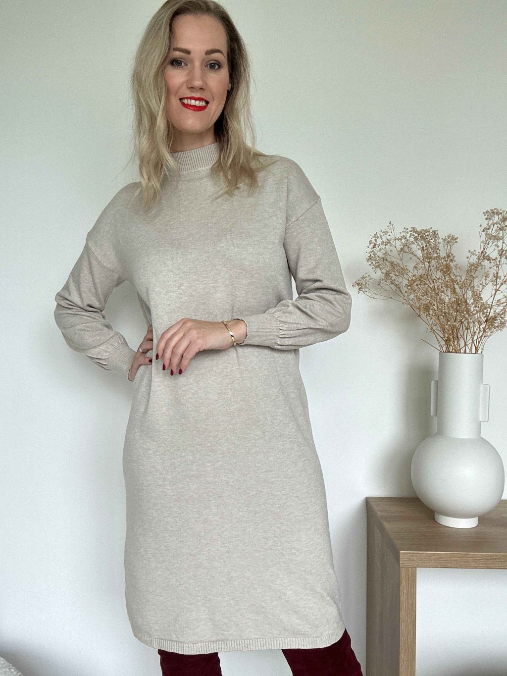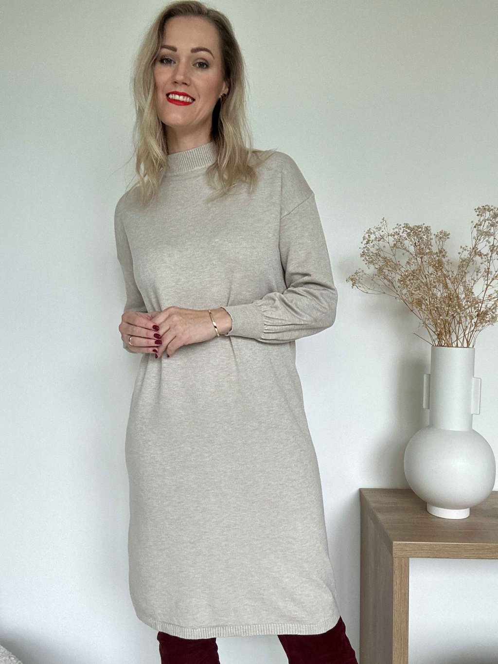 Svetrové šaty so stojačikom-smotanové