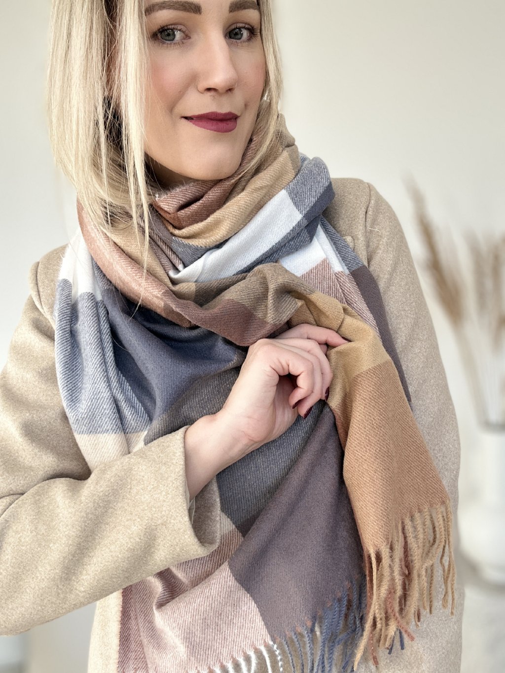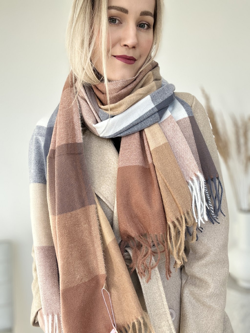 Teplý vlnený karovaný šál obdĺžikového tvaru ukončený strapcami.