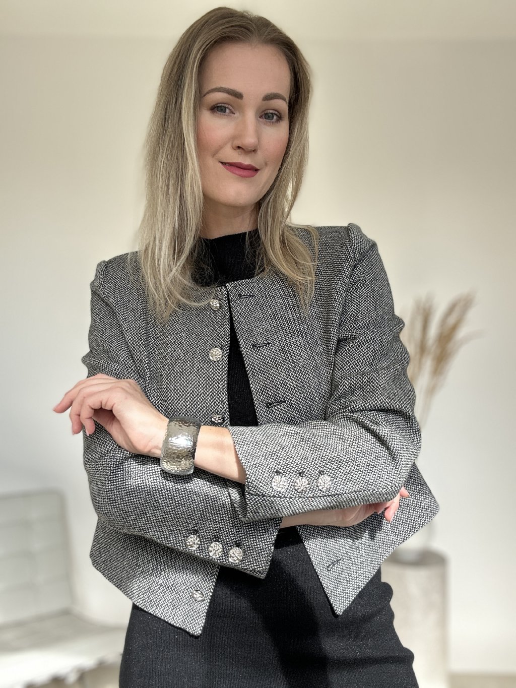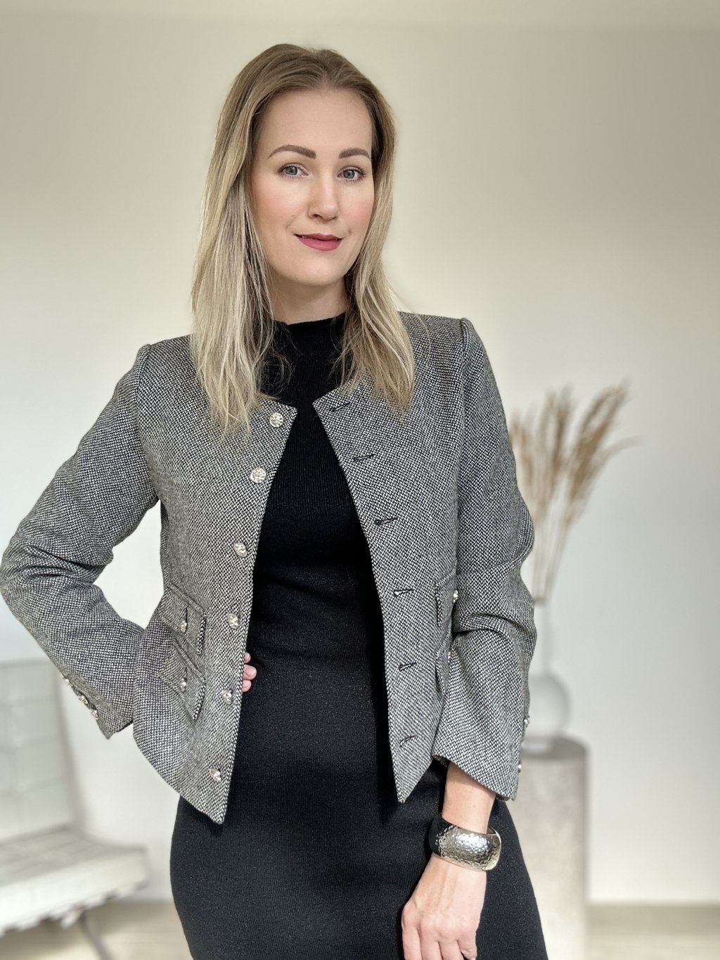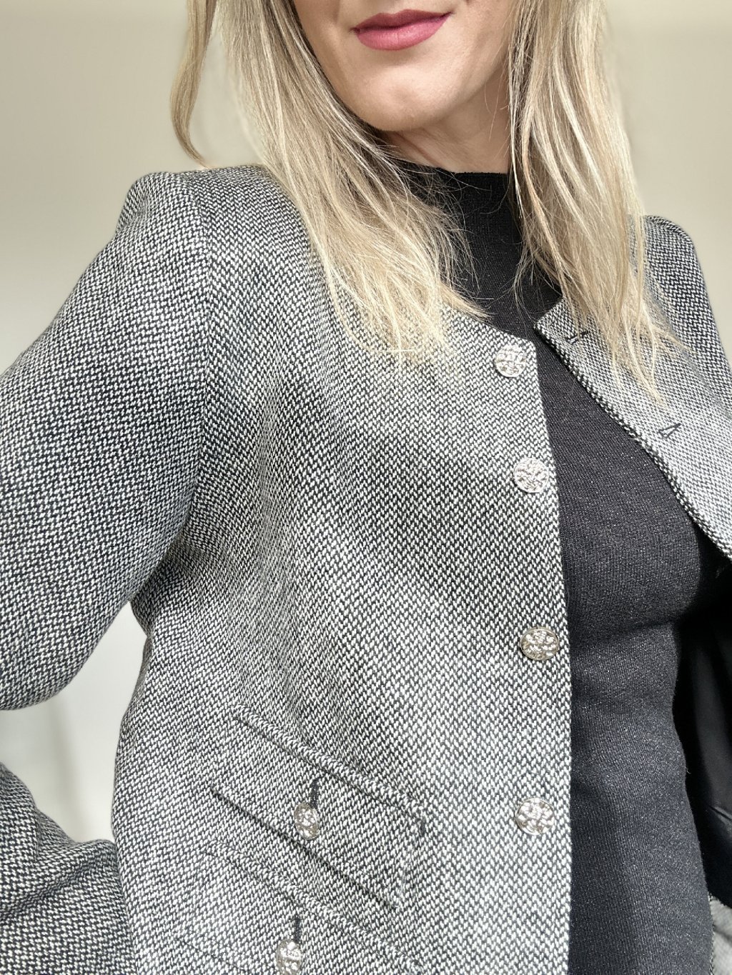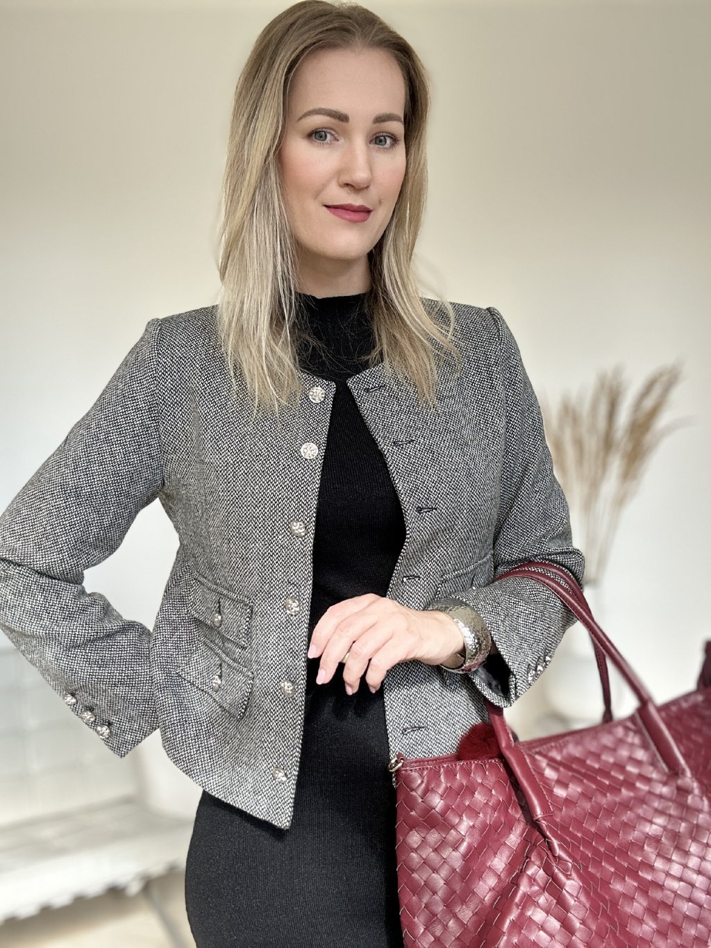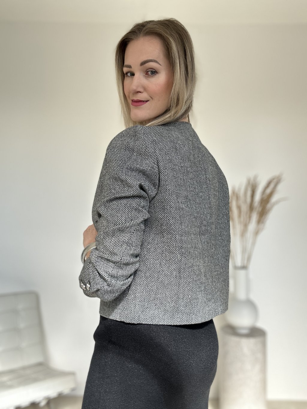 Perfektné sako/kabátik/ s okrúhlim výstrihom bez goliera a zapínanie na jeden rad zlatých gombíkov. Zlaté kombíky sú výrazným detailom, ktorý sa opakuje na zapínaní aj na vreckách.