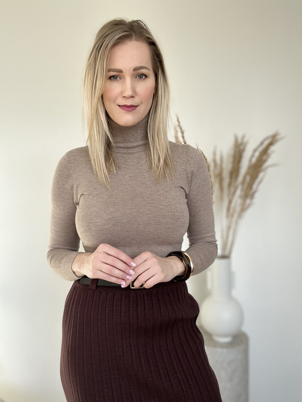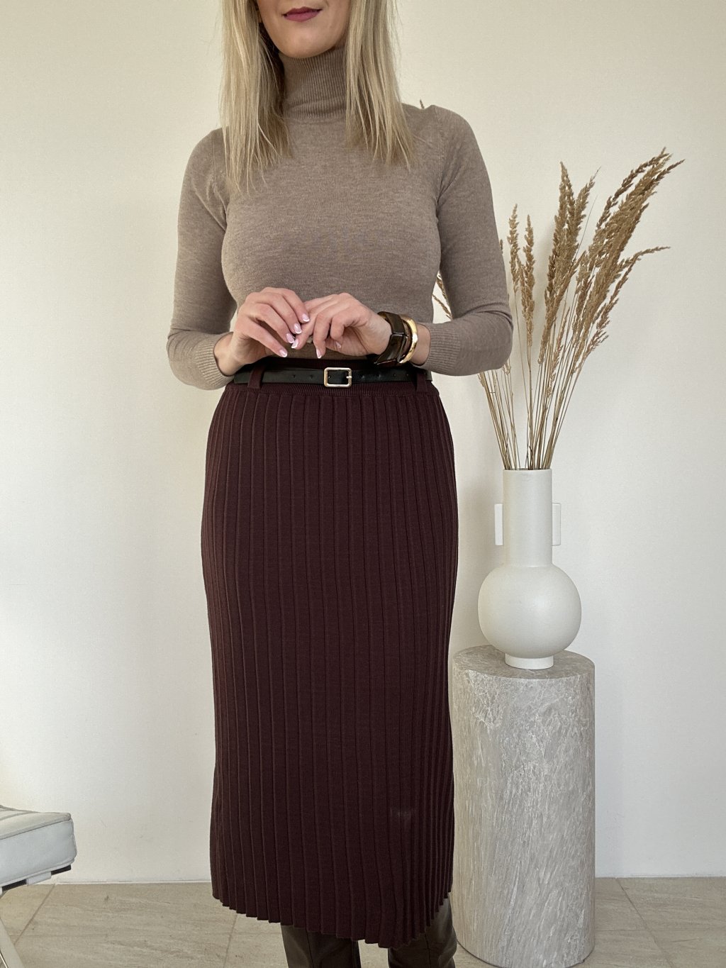 Hnedá rebrovaná pletená sukňa s gumou v páse a s opasokom. Perfektne kombinovateľná k jesenným a zimným outfitom.