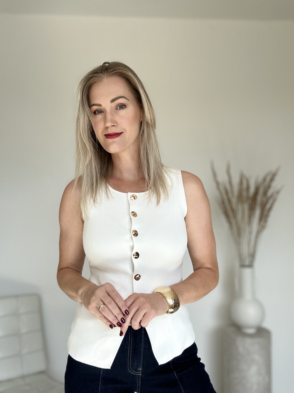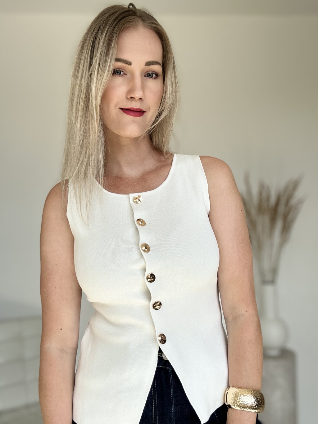 Úpletová vesta so zlatými gombíkmi. Môže slúžiť ako samostatný top alebo ako vesta, ktorá sa dá vrstviť na iné oblečenie.