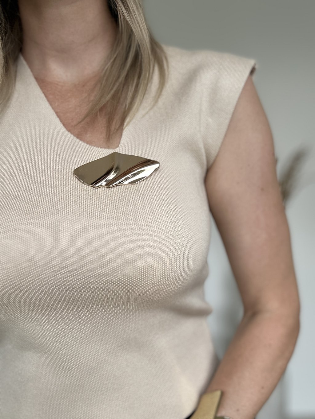 Elastický úpletový top bez rukávoch s výstrihom a zdobený pozláteným listom.