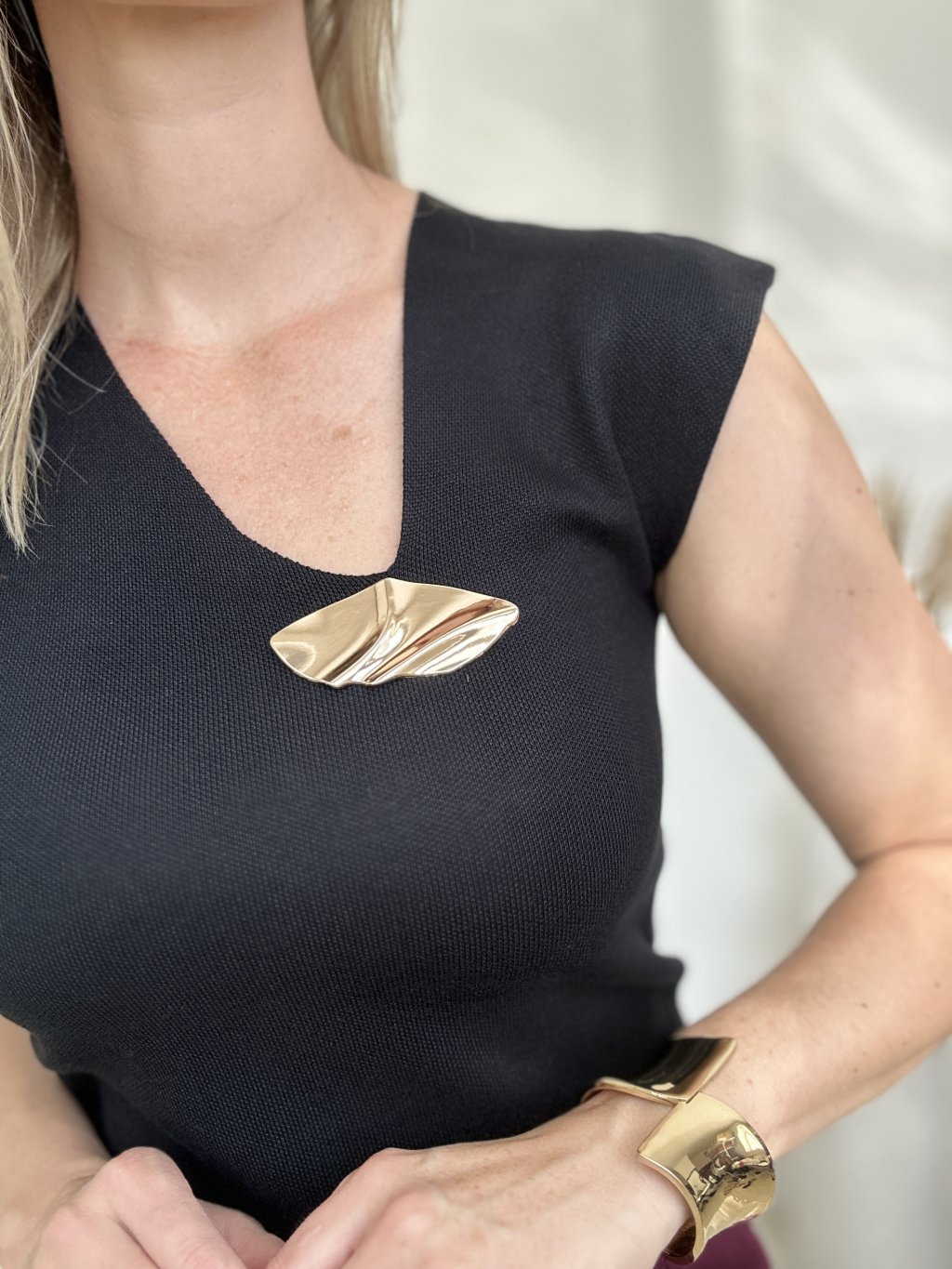 Elastický úpletový top bez rukávoch s výstrihom a zdobený pozláteným listom.