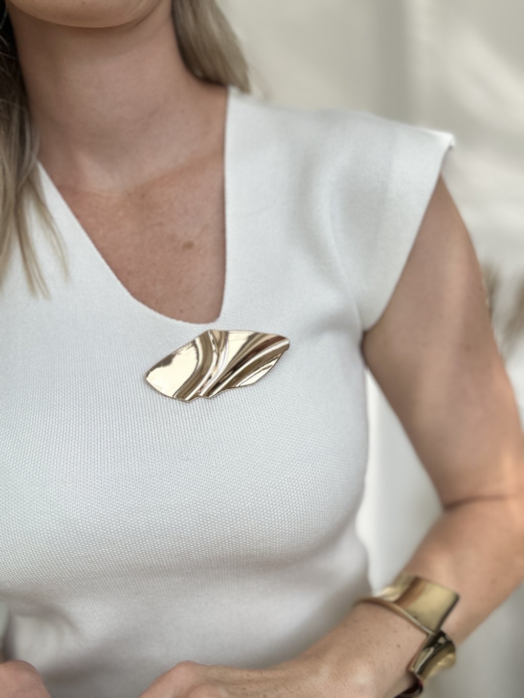Elastický úpletový top bez rukávoch s výstrihom a zdobený pozláteným listom.