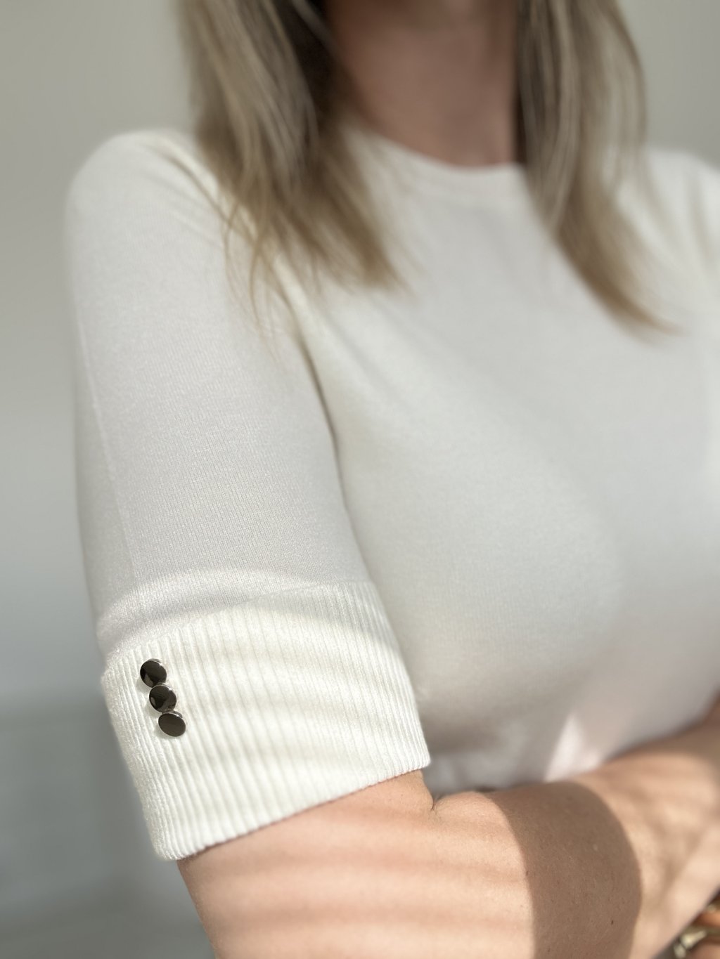 Jemný úpletový elastický top a krátkym rukávom a ozdobnými gombíkmi.