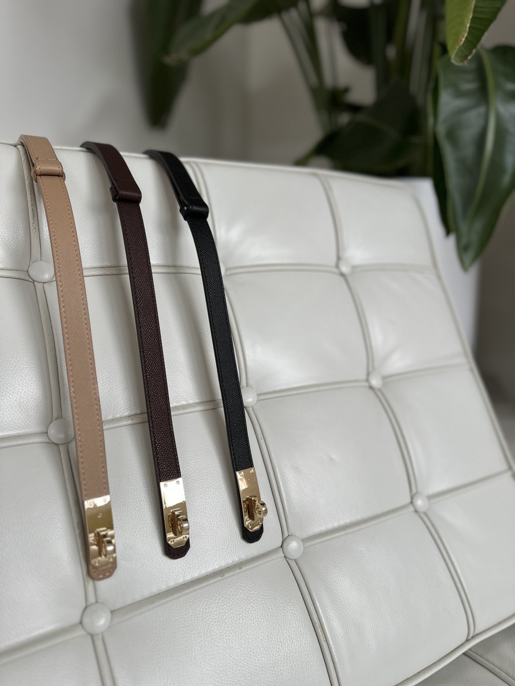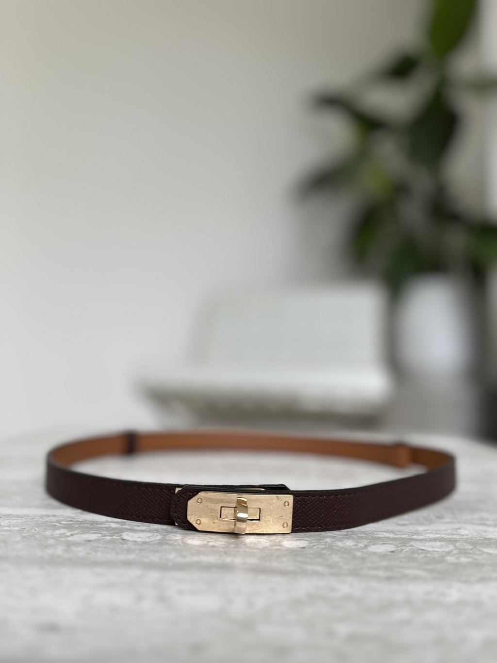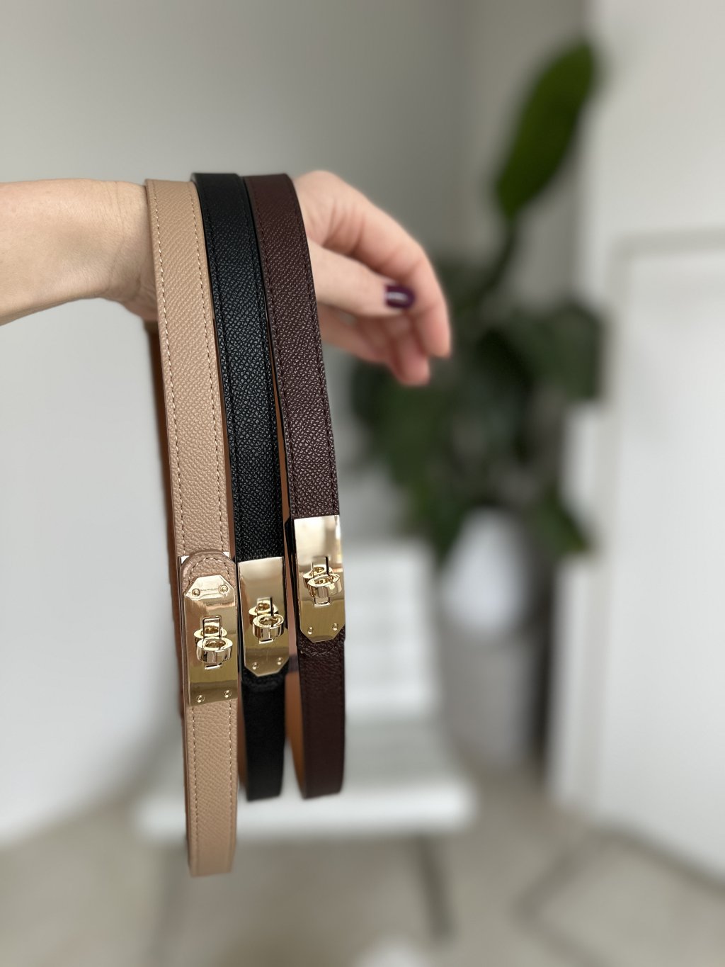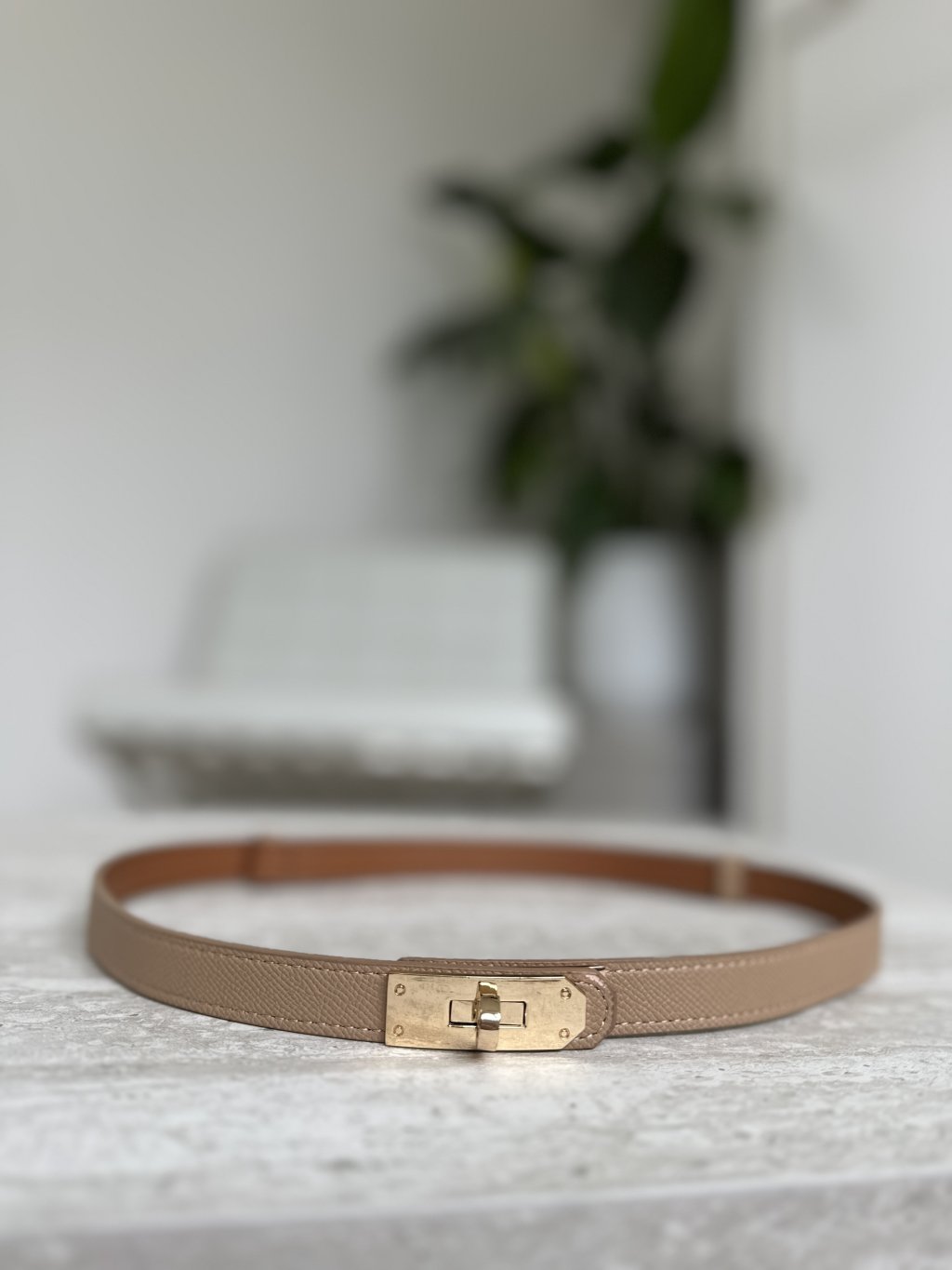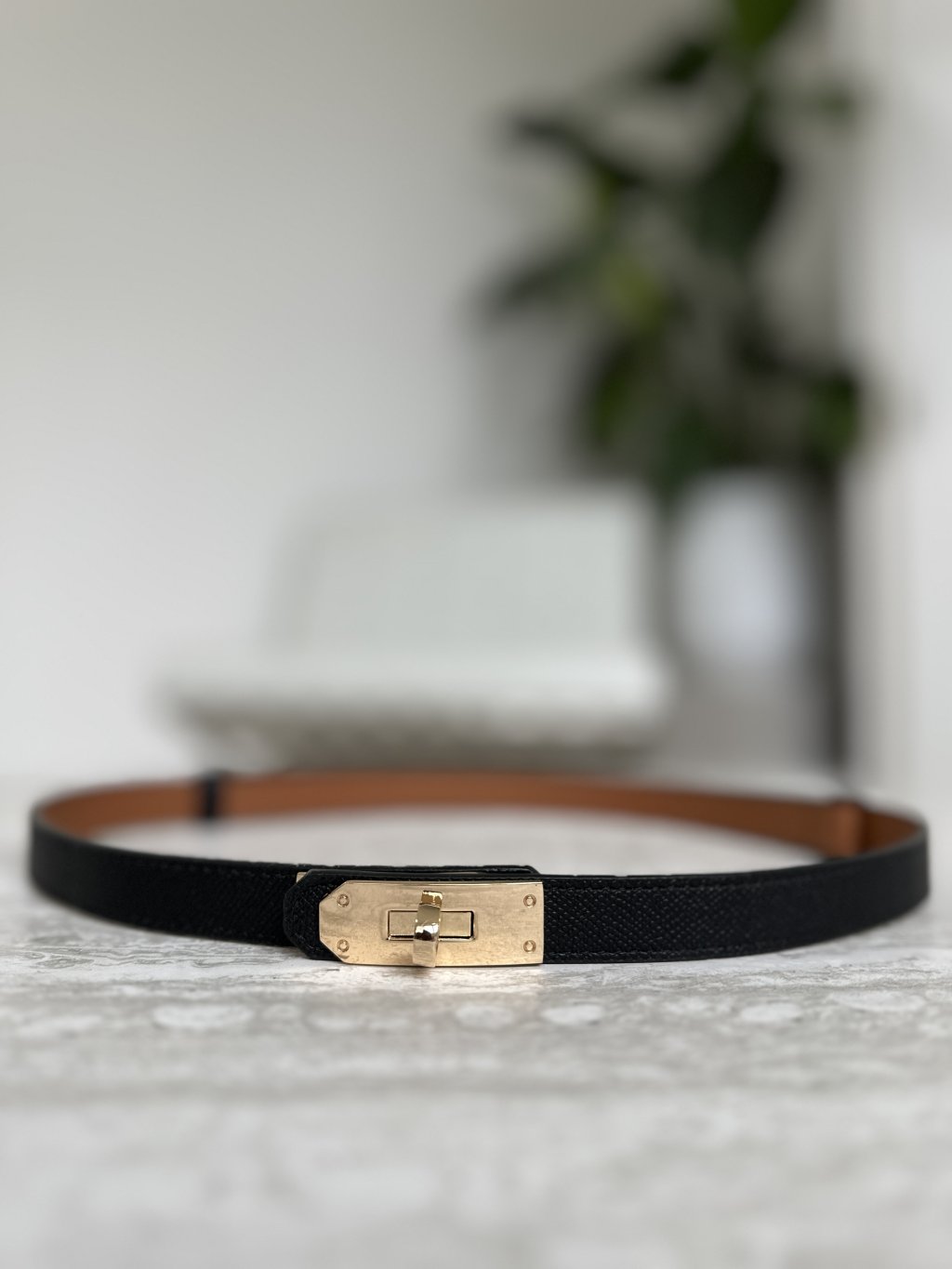 Dámsky úzky koženkový opasok s charakteristickou zlatou otočnou sponou. Tento štýl opasku, často označovaný ako „Kelly“,