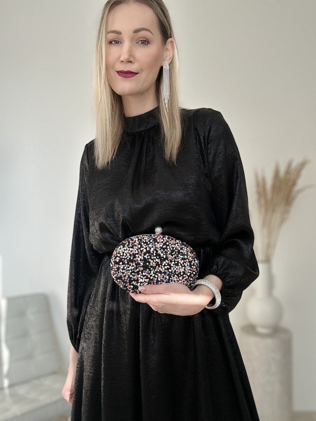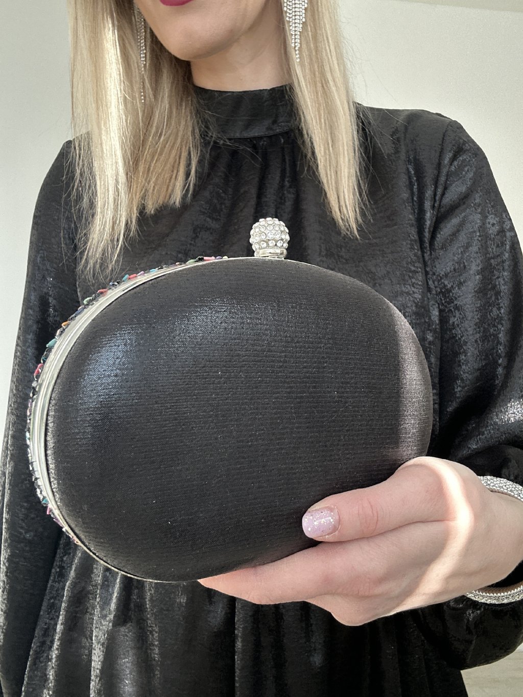 Viacfarebná clutch kabelka s kamienkovým zdobením je štýlovým doplnkom, ktorý sa hodí na rôzne špeciálne príležitosti.