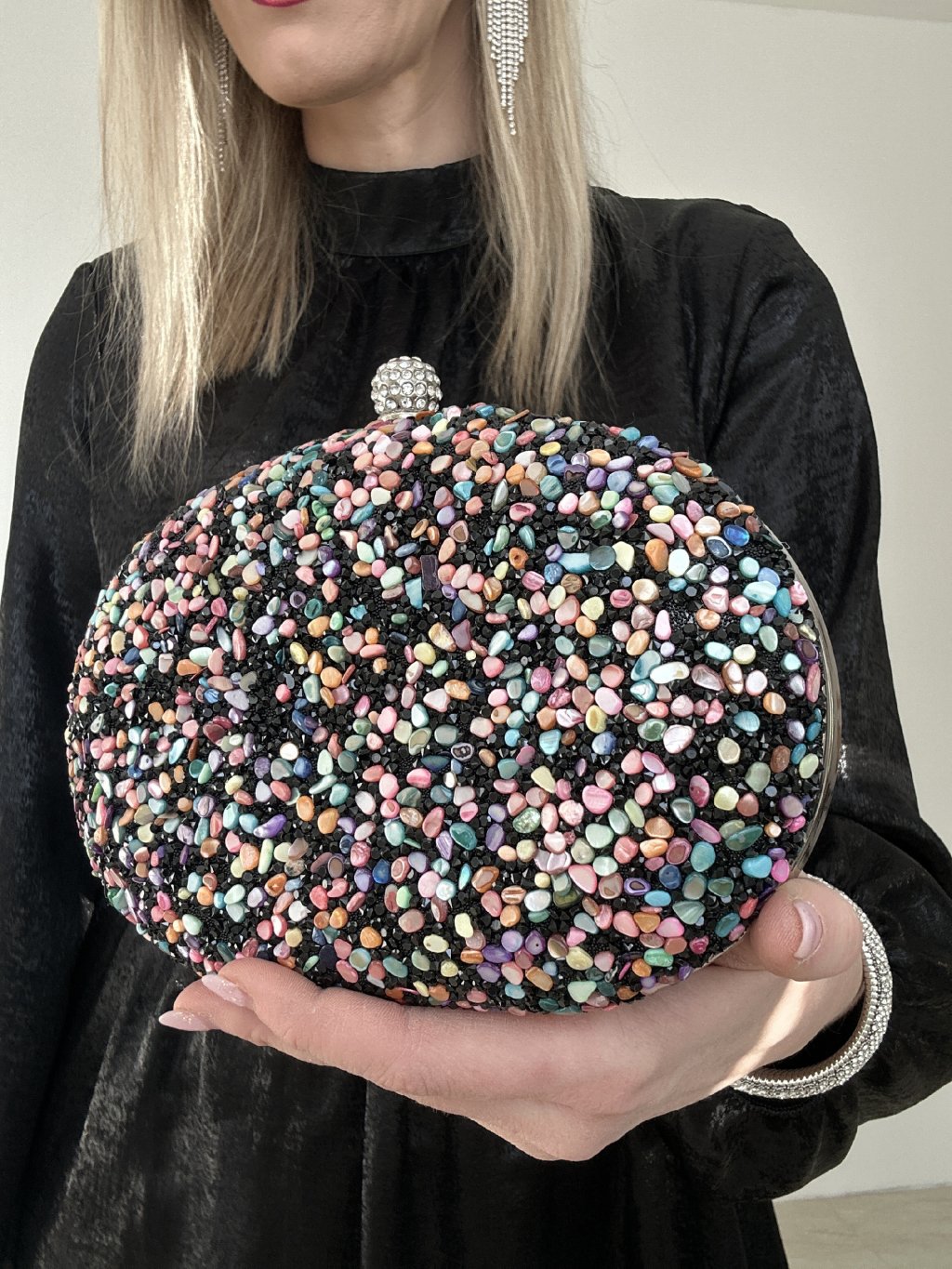 Viacfarebná clutch kabelka s kamienkovým zdobením je štýlovým doplnkom, ktorý sa hodí na rôzne špeciálne príležitosti. Kabelka má oválny tvar, zlaté kovanie a možno ju nájsť v ponuke rôznych predajcov špecializujúcich sa na spoločenské doplnky