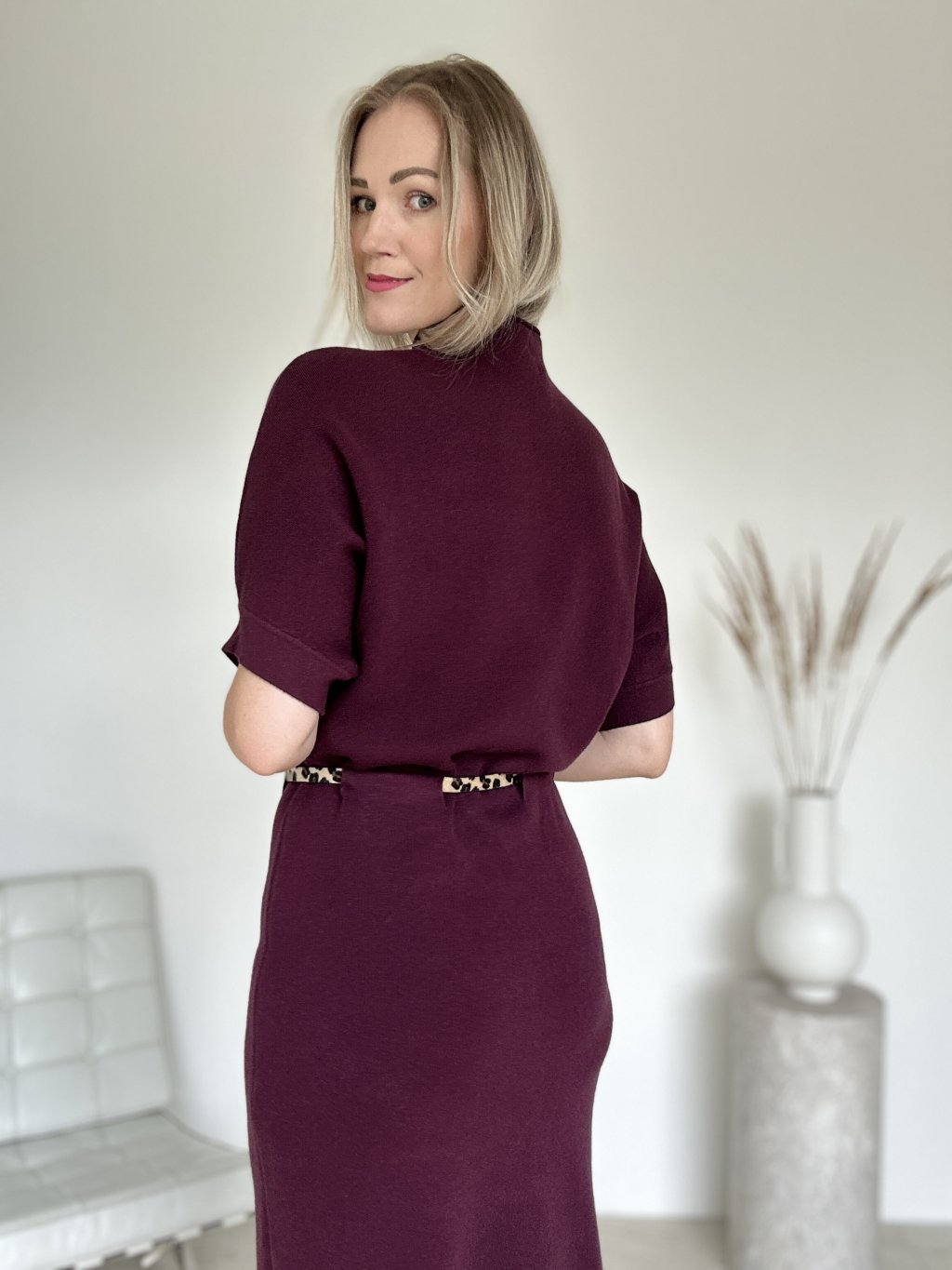 Nadčasové pletené šaty s vysokým golierom a krátkymi rukávmi. Šaty majú rovný strih a sú doplnené tenkým opaskom s kovovou prackou, ktorá má leopardí vzor. Šaty pôsobia elegantne a pohodlne , vhodné na každodenné nosenie alebo príležitosti, kde sa vyžaduje štýlový, no zároveň uvoľnený vzhľad.