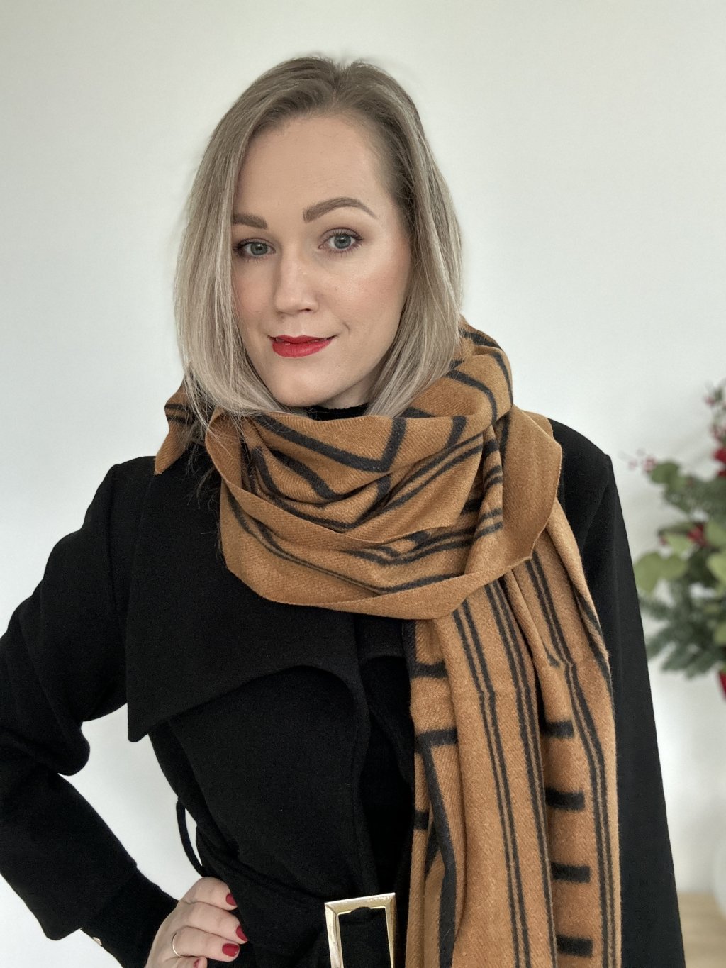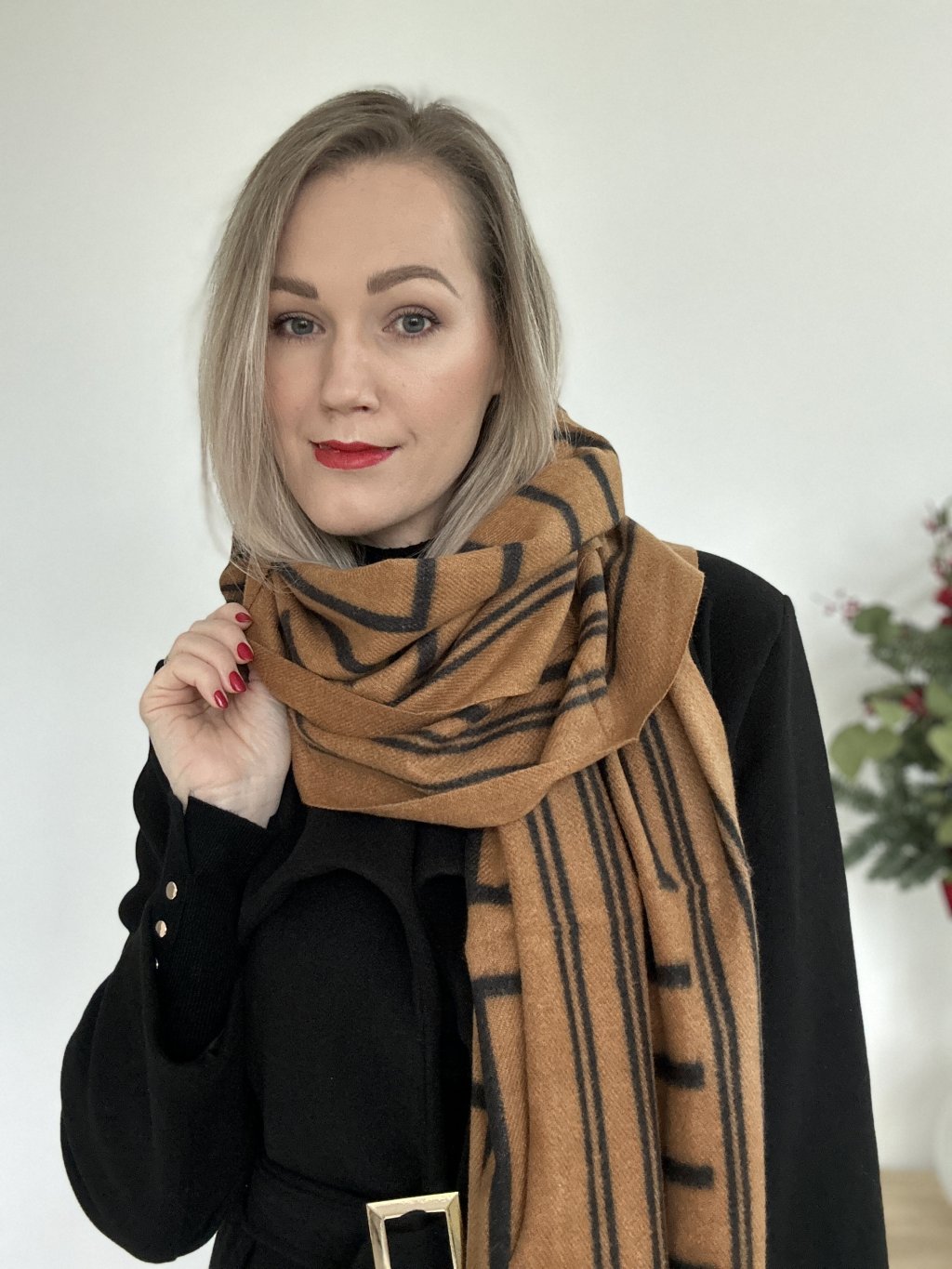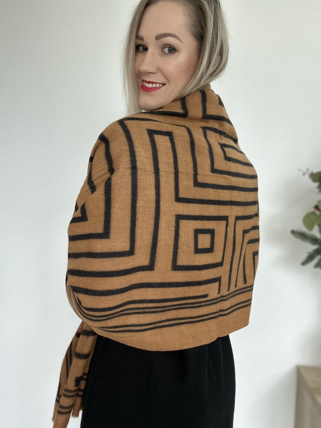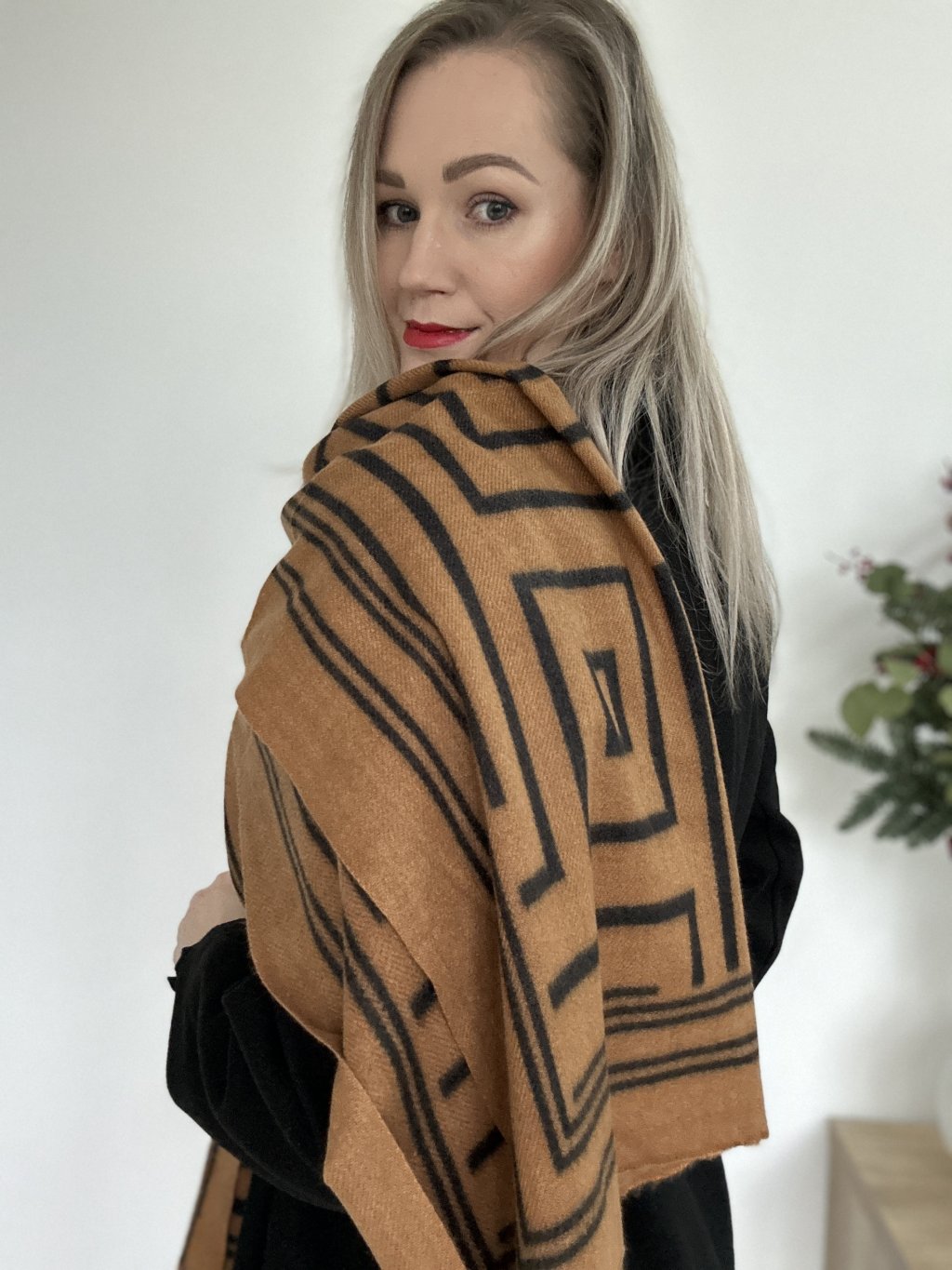 Vlnený vzorovaný šál obdĺžnikového tvaru.