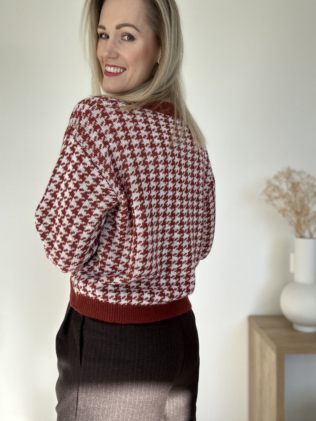 Sveter klasického strihu, príjemného materiálu a štýlového vzoru.