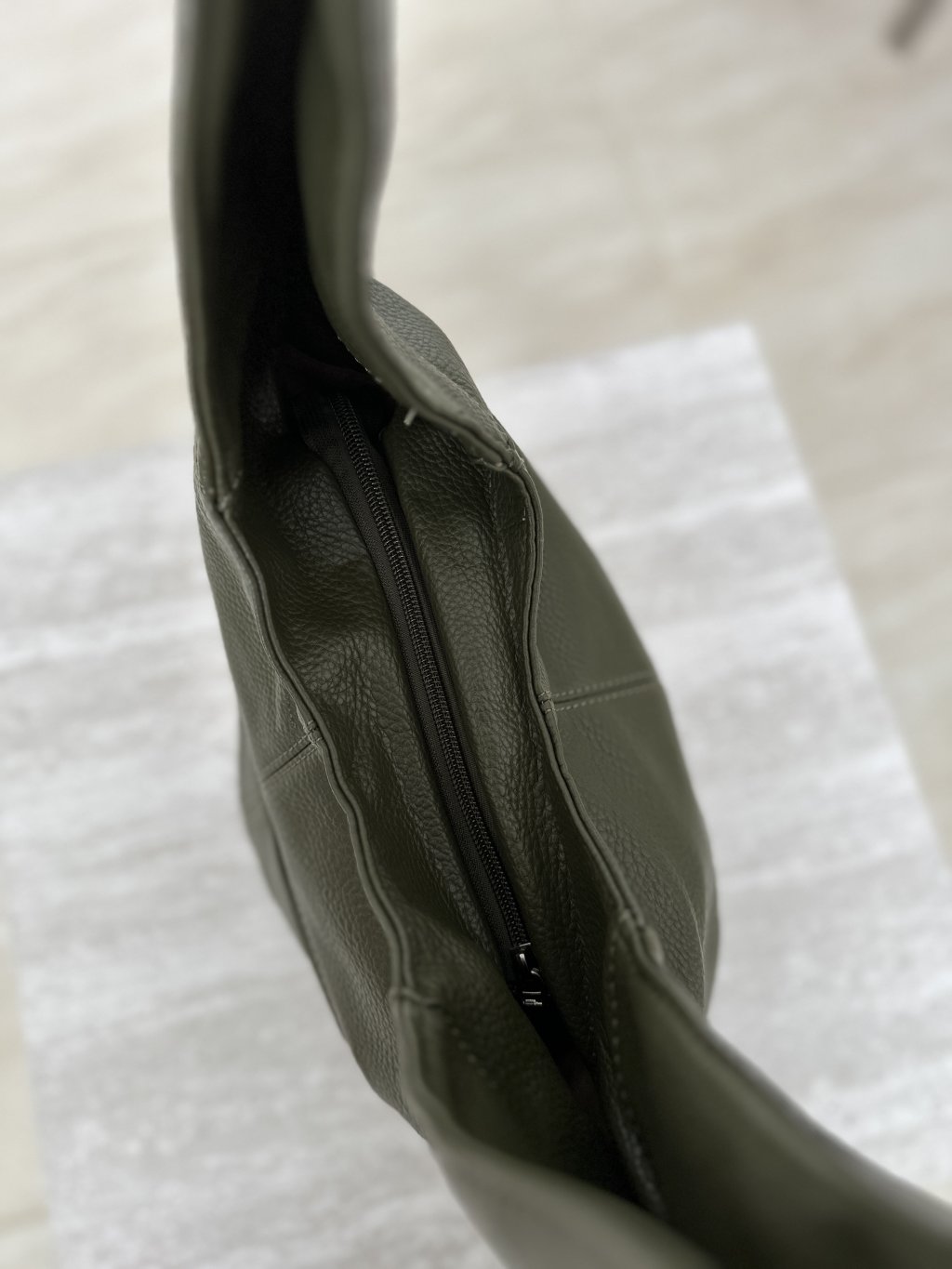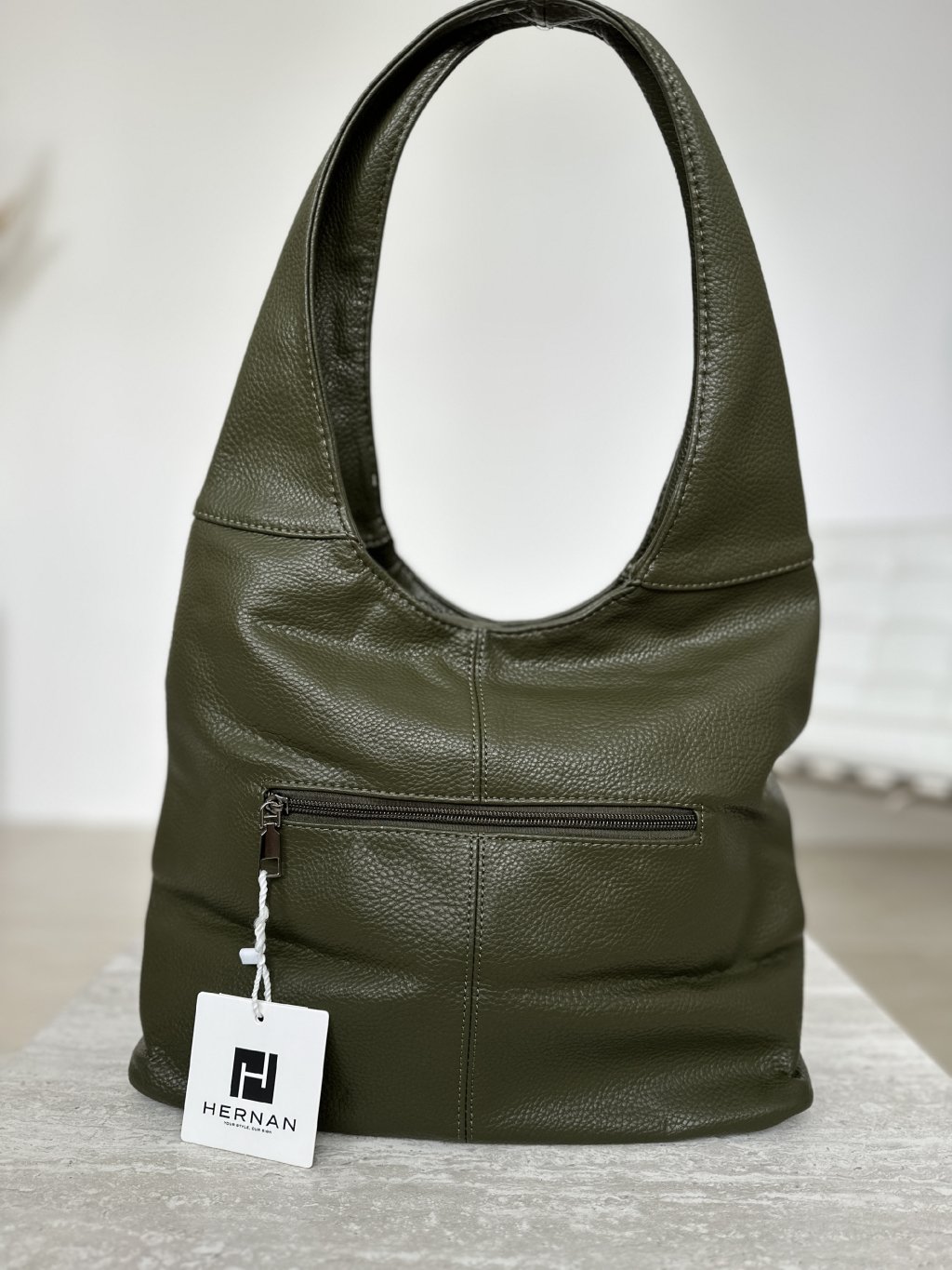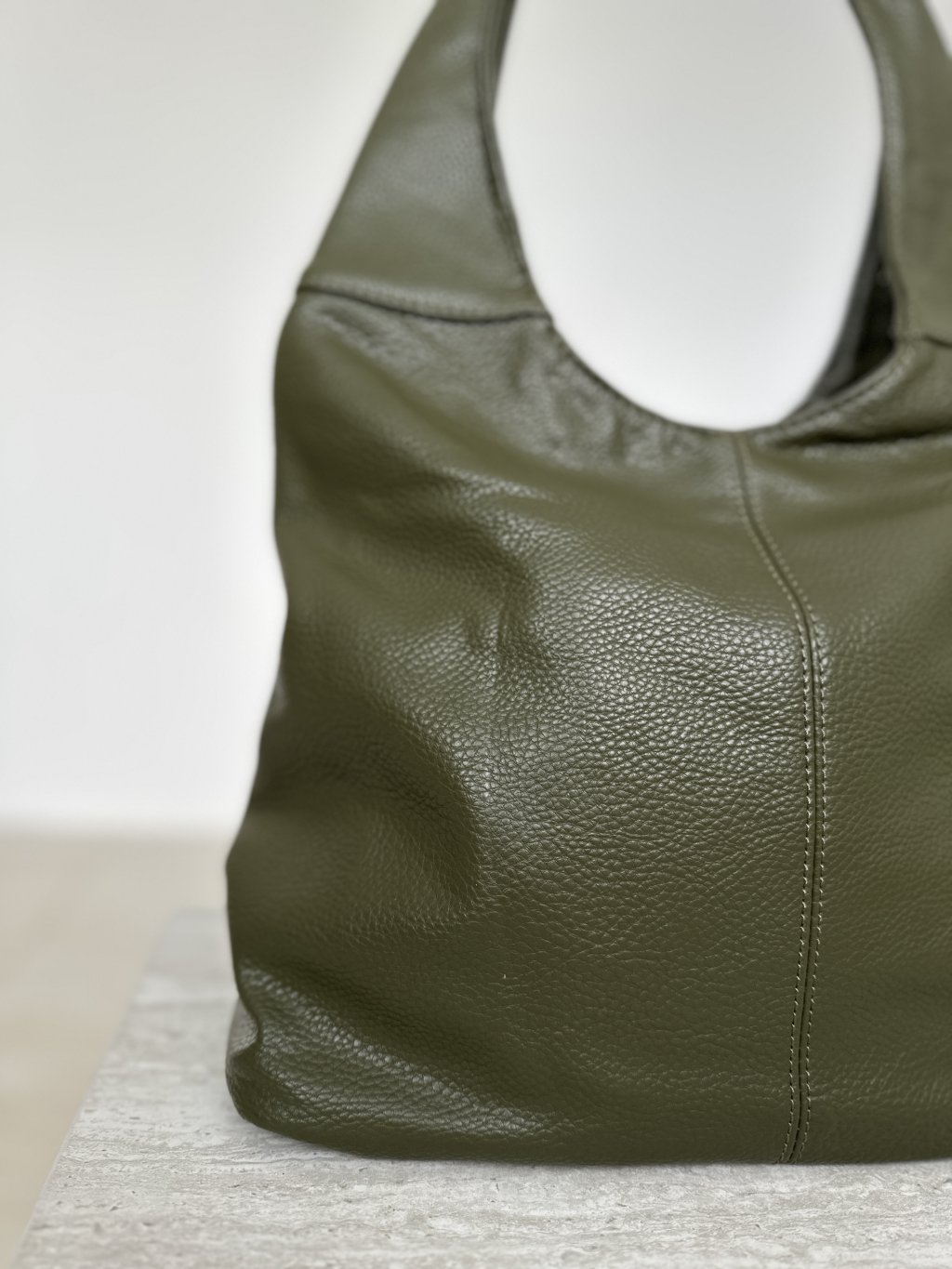 Zelená koženková taška /kabelka / v štýle HOBO je vyrobená z umelej kože s mäkkou, zrnitou textúrou, má zakrivenú siluetu a jednofarebný dizajn.