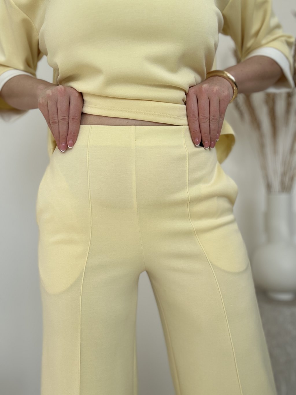 Svetložltý voľnočasový komplet, ktorý v sebe spája prvky teplákového setu a elegantnejšej pleteniny.